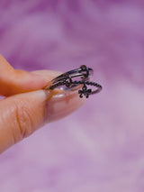 - Design: 3 linked stacked rings with black gold hoops and bow charm- dual tone