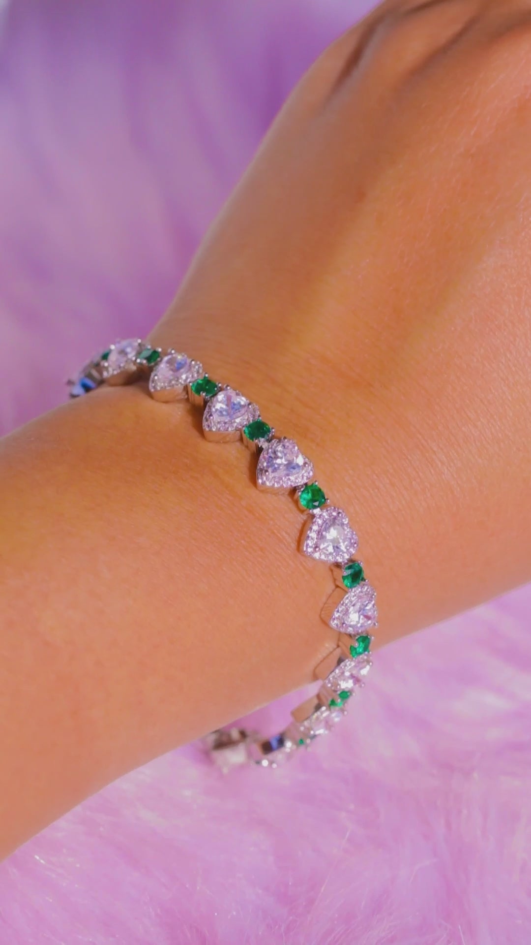 - Design: Heart tennis bracelet with green crystals and white crystals