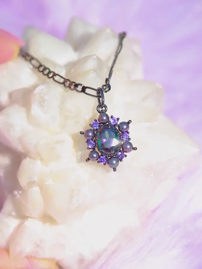 - Design: Mystic topaz crystal with a halo of black iridescent pearls and purple crystals