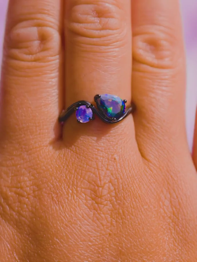 - Design: Mystic topaz and lilac moonstone crystal on a black gold curved band