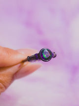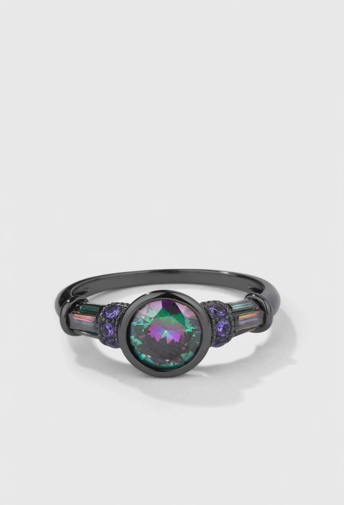 - Design: Mystic topaz crystal with purple side crystals on a vintage band