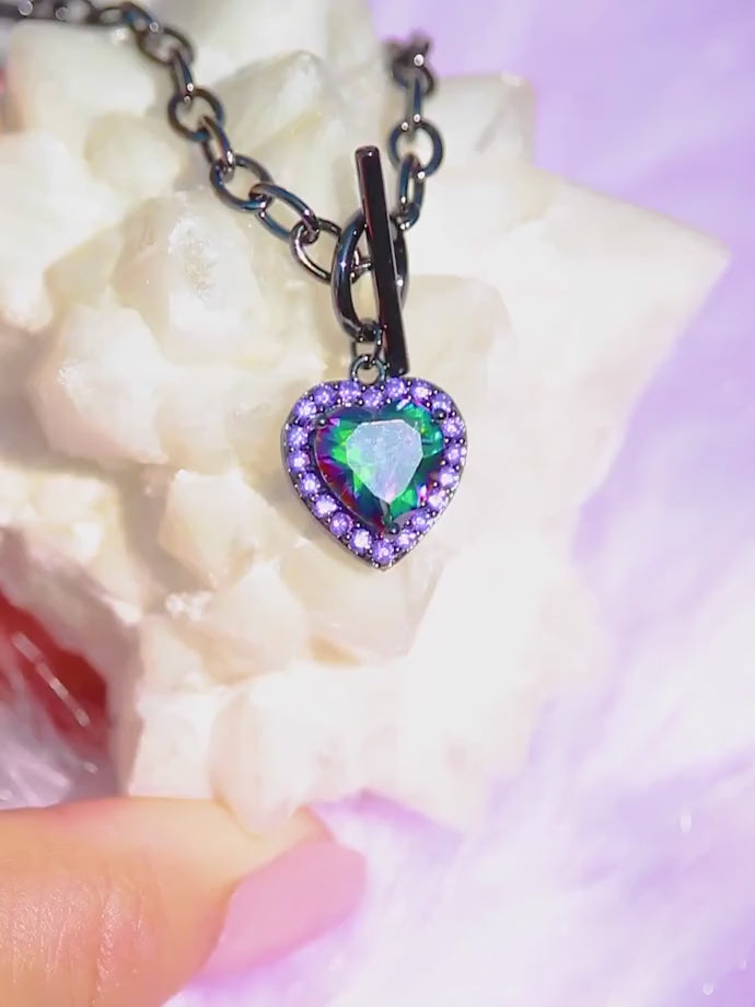 - Design: Mystic topaz heart crystal pendant with halo of purple crystals on toggle chain